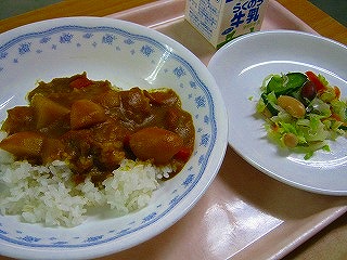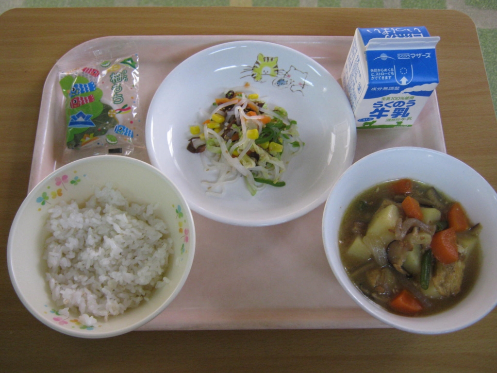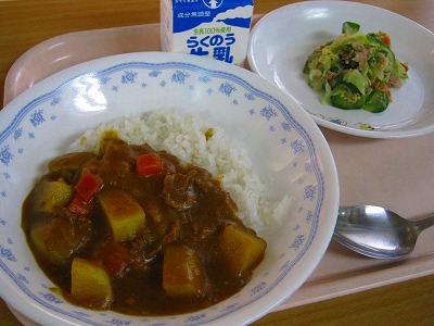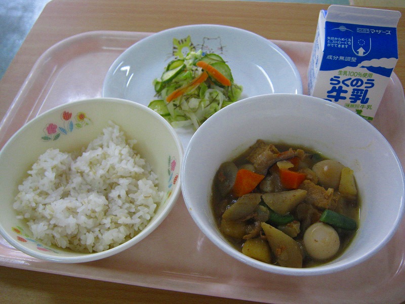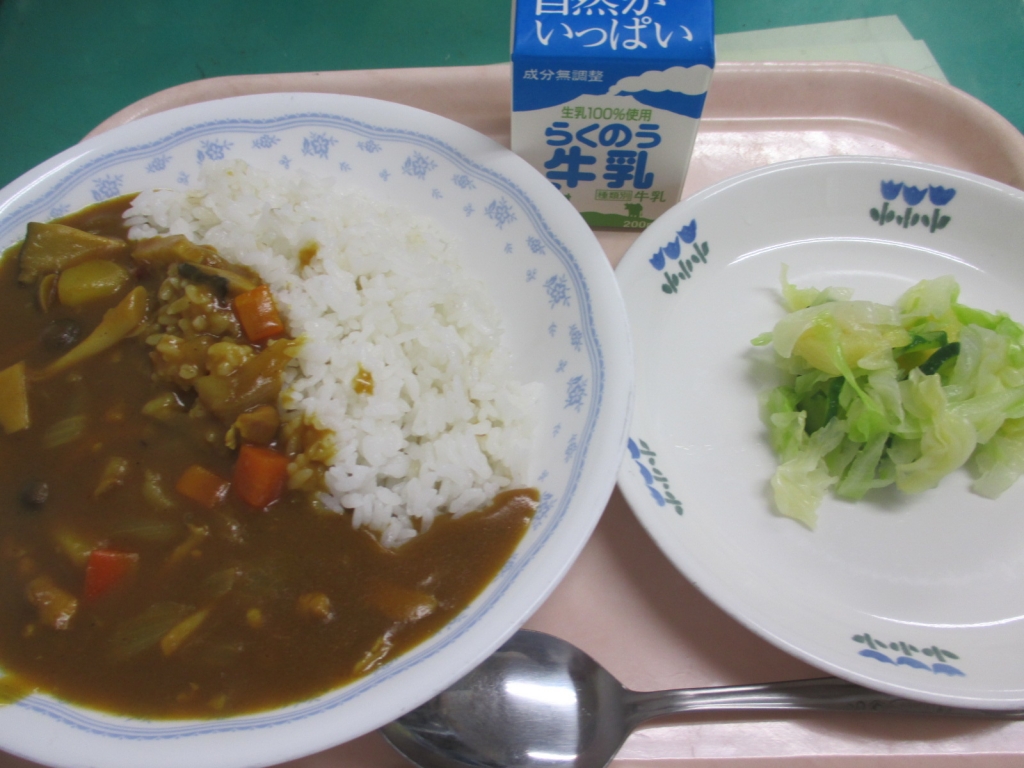 今日は給食センター特製、大人気のカレーライスでした。50㎏の新たまねぎを40分かけてじっくり炒めて作りました。1年生にとって初めてのカレーライス・・・「辛さはどうかな?」と思い、教室に行ってみると「おいしい!」と言ってよく食べていました。