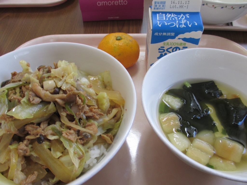 今日はお野菜たっぷりの「豚キャベ丼」の登場でした。豚肉よりキャベツの割合の方が多かった(笑)ですが、野菜の量も結構あったのでお腹いっぱいになったようでした。今年度初のみかんも付きました。皮が柔らかくむきやすく、甘かったので人気でした。ビタミンCがたくさん入っていて、風邪予防に効くので今からしっかり摂ってほしい果物のひとつです♪