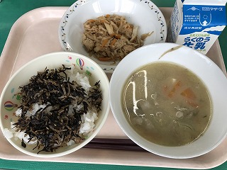 今日19日は「ふるさとくまさんデー」で県内各地の味を紹介しています。今月は宇城地方の味で「びりん飯」の登場でした。豆腐を油で「びりんびりん♪」と炒めることからびりん飯という名前が付きました。子どもたちは豆腐の存在には気付かず「ひき肉かと思いましたー!」と言いながら食べていました。混ぜご飯はやっぱり人気ですね♪