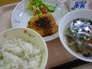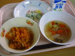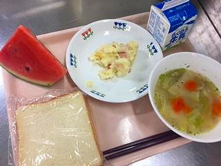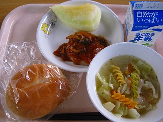 今日は、夏野菜のひとつである冬瓜を使ったスープでした。2年生の教室で、「冬瓜が入っているよ。」と伝えると、一生懸命さがしていました。「とろとろしておいしい!」と言って食べていました。