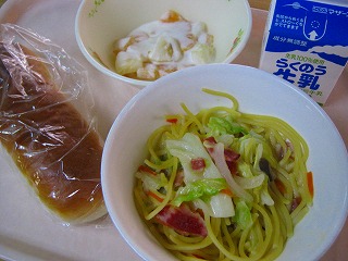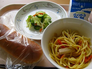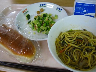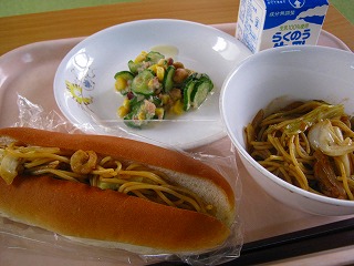 今日は、焼きそばをパンにはさんで焼きそばパンにして食べました。給食の麺料理は大量調理であることと食べるまでに時間があるので伸びてしまうのが悩みです。そんな時に活躍するのがスパゲティ麺です。今日は細めのスパゲティを使い、調理員さんの巧みな技術によって伸びていないおいしい焼きそばができました。