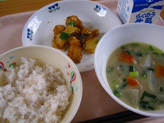 今日も寒かったので、ご汁で温まった様子の子どもたちでした。いわしの丸干しは、「頭と腹の部分が苦いー!だけど、しっぽの方は苦くなくておいしい!」といろいろな感想が…。1年生、大丈夫かなと心配しましたが、頑張って食べていました♪