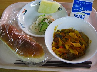 今日は、今年初めてのミニトマトがつきました。高森町でとれた旬のトマトです。また、かぼちゃを使ったチーズ焼きも登場しました。かぼちゃも夏野菜のひとつですね。夏づくしの給食で暑い1日を乗り越えてほしいものです。