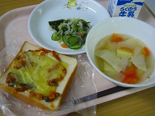 今日は久しぶりのピザトーストです。380枚作りました。朝から野菜を切って具を作り、1枚1枚具をのせていきます。さらにチーズをのせて焼いていきます。作る手間はかかりますが、子どもたちの喜ぶ顔を思い浮かべながら作りました。