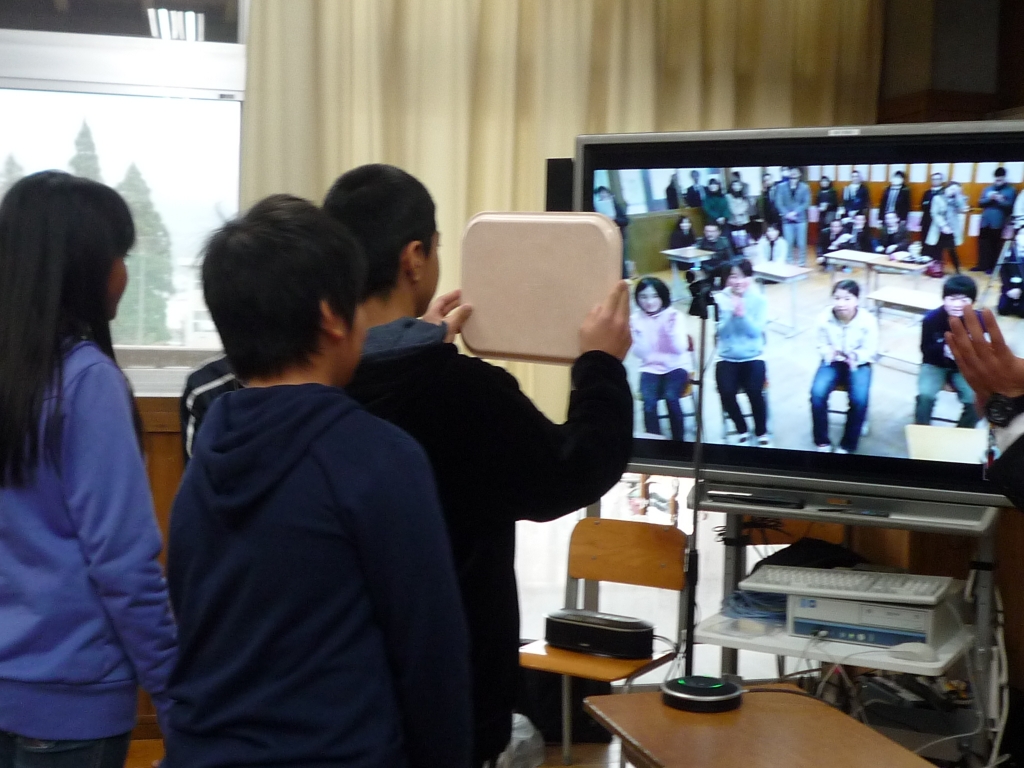 テレビ会議システムを使い、高森東小の子どもたちと積極的にコミュニケーションを図ったり、自分たちの考えを発信したりする。