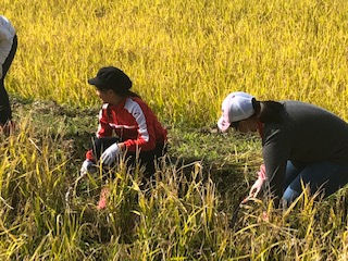 今日は5年生の稲刈りをしました。今朝は小雨でしたが、昼はきれいに晴れました。茶碗1杯にどれくらい米粒が入っているでしょう?と4月に話をしましたが約3500粒としっかり覚えていてくれました。今日の稲刈りでどれくらいのもち米が収穫できるか楽しみです。今後の給食、餅つきに活用していきます。