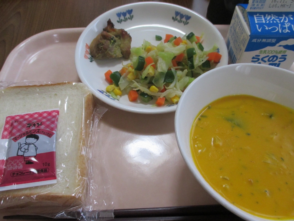 今日はジャマイカ料理の「ジャークチキン」の登場でした。カレー粉を効かせたちょっぴりスパイシーな一品です!生のお肉のときは、結構大きくボリュームもあったのですが、出来上がりは…1年生のお口にひと口で入ってしまうくらい小さくなっていました!!実際1年生の男の子がひと口で食べてました(笑)ジューシーに仕上げるためにはじめはスチームを入れ、蒸し焼きにしたのですが、焦げ目が全くつかず、その後焦げ目をつけるためにオーブンで焼きました。焼き目がないと全くおいしそうに見えず、料理は見た目も大事なんだなと改めて感じたところでした。