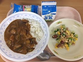 夏野菜たっぷりカレー☆ 投稿日時 : 2018/07/20 管理 7月20日(金)・夏野菜カレー・牛乳・コロコロサラダ・フローズンパイン 今日は1学期前半が終わり、夏休み前最後の給食でした。今年は、梅雨明けが早く暑くなり、子どもたちの食欲も落ちる日が続きました。しかし、今日は子どもたちの好きなカレーです。夏バテを予防するトマト、なす、かぼちゃ、枝豆などの夏野菜をたっぷり使ったカレーでした。よく食べてありました。夏休みも元気いっぱいに過ごしてほしいと思います。 {{options.likeCount}} {{options.likeCount}}