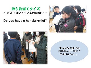 5年生の英語の授業風景です。この日は授業参観でした。"Do you have a ~?""Yes, I do.""No, I don't."を使って、持ち物当てクイズをしました。後半は、チャレンジタイムと題して、参観されている保護者とやりとりをしました。はじめは少し照れていましたが、次第にノリノリになる子どもたちでした。保護者の方が入れたものを音とヒントで予想しました。カイロや鍵やネックウォーマーなどなど、和気あいあいとした雰囲気の英語の授業となりました。