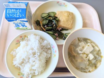 6月19日 投稿日時 : 2023/06/19 管理 今日のメニュー ★麦ごはん ★あおさのみそ汁 ★信田煮 ★たこの酢の物 ★牛乳 今日は、「ふるさとくまさんデー天草地域」です。天草の特産品、あおさやたこを使ったメニューをおいしくいただきました!