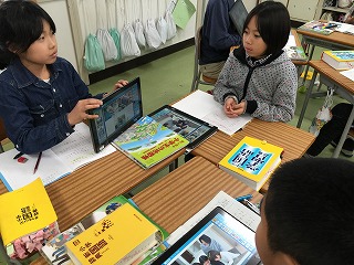 日常活用~気づきの交流~タブレットPC 投稿日時 : 2015/12/09 教職員3 カテゴリ:社会 日常の社会科学習の様子です。今回の5年2組の社会科は、タブレットPCに配布された資料から、気づいたことを交流し、学習問題につなげる授業展開を行いました。分からに言葉は辞書で調べながら、少ない資料から様々な情報を読み取っていきます。この姿が日常となりつつあります。当たり前のようにタブレットPCを準備し、辞書や資料集と同じように活用していく。自分の思考を支えるツールとなりつつあります。研究発表会分科会で教えていただいた「子どもたちの目線」も変化が見えてきました。