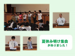 夏休み明け集会がありました! 投稿日時 : 2015/08/28 7年部 今日から1学期後半がスタートしました。2時間目に夏休み明け集会がありました。学年代表の「夏休みにがんばったことと目標」の発表がありました。お手伝いやプールでの泳ぎの練習、そして勉強と充実した夏休みだったようです。来週から本格的に運動会にむけての練習が始まります。早寝・早起き・朝ごはん、生活リズムを整えて、元気いっぱいがんばりましょう。 {{options.likeCount}} {{options.likeCount}}