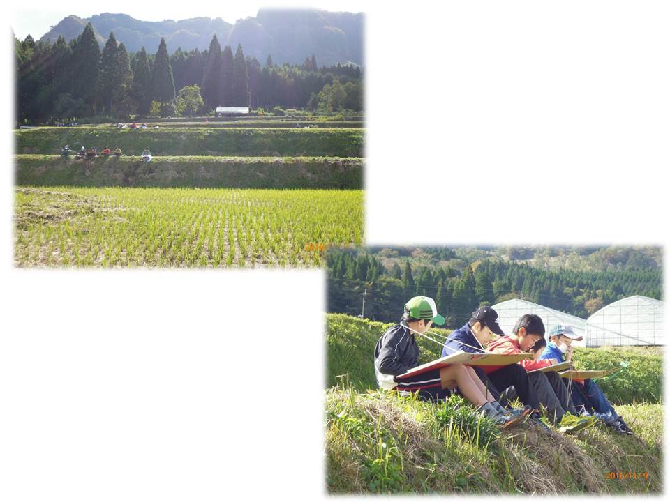 5年生は8日(火)に棚田スケッチを行いました。南在へ30分ほど歩くと、そこには、棚田が広がっていました。手前には幾重にも重なる棚田、奥には阿蘇五岳とすばらしい景色でした。5年生はそのすばらしい風景をスケッチしました。友だちと話をしながら楽しく、そして真剣に描く姿が見られました。昼食は南在の方からおにぎりと豚汁の差し入れをいただきました。とても温かくおいしかったです。そして、この棚田の1人1人の絵を年賀状にしていただけるそうです。とても楽しみです。