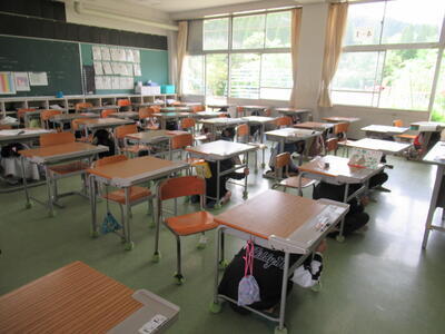4月26日(火)2校時に地震避難訓練を行いました。あいにく雨が心配されたため運動場への避難は実施せず、地震が起きたら①机の下に頭を入れ、机の脚を持ち、静かに待つ②揺れがおさまったら先生の指示に従い避難する等を確認しました。また、家庭ではどうするのか、屋外ではどうするか等指導しました。もしも、家に一人でいる時どこへ避難するのか、何に気をつけるのか家庭でも確認していただきたいと思います。