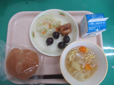 牛乳、丸パン、チキン・ボイルキャベツ、マカロニスープ、巨峰