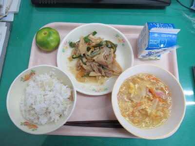 牛乳、麦ご飯、スーミータン、チンジャオロース、みかん