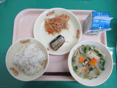 牛乳、麦ご飯、さんまのみぞれ煮、おかか和え、だんご汁
