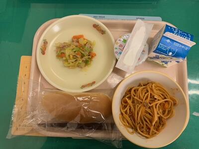 牛乳、コッペパン、ミートスパゲティ、ツナサラダ、チョコプリン