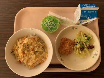牛乳、ロースカツ丼、かみかみ和え、リンゴゼリー