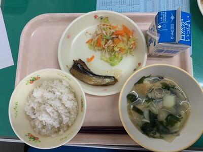 牛乳、麦ご飯、じゃがいもと玉ねぎのみそしる、切り干し大根のごまずあえ、いわしのしょうがに