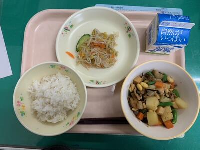 牛乳、麦ご飯、もやしのうめあえ、だいずのいそに