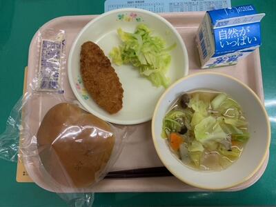 牛乳、丸パン、ホキフライ、ボイルキャベツ(フィッシュバーガー)、ラビオリスープ