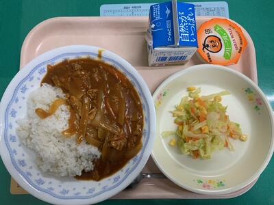 牛乳、ハヤシライス、コーンサラダ、フルーツムース