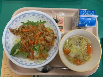 今日はロースカツどんでした。ご飯の上にぐざいをのせたあと、ロースカツをのせたら、完成です。豚肉のロースはやわらかく、ジューシーでたっぷりのぐざいの味がしみこんで大変おいしくいただきました。