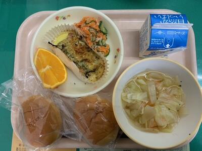 牛乳、テーブルロール、にんじんサラダ、マカロニスープ、とりにくのこうそうやき、ネーブル