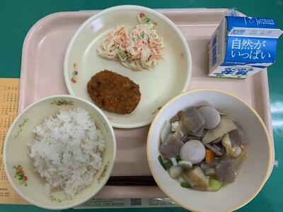 牛乳、麦ご飯、れんこんのはさみあげ、いとかまぼこと切り干し大根の和え物、こんさい汁