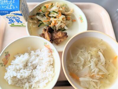 中華丼は、ご飯の上に」八宝菜を乗せた料理です。八宝菜の「八」には、「たくさんの」という意味があります。今日の中華丼には、14種類の食材が使われていました。