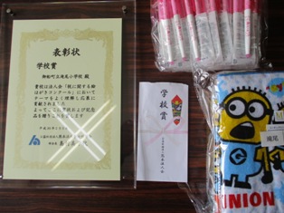 今回、県下4955点の応募があり、その中から本校が学校賞をいただき、次の子どもたちが受賞しています。応募した5・6年生全員にも参加賞もいただきました。