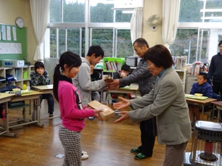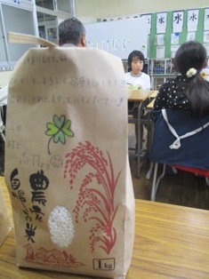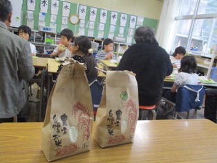 2学期末、天草:倉岳小学校5年生から支援としてもち米をいただきました。 高学年でインフルエンザの流行もあり餅つきができず、8日(木)の交流給食時にあったかサポーターの皆さんに倉岳小学校からいただいたものであることをお伝えしてプレゼントしました。小分けした袋に4・5年生があったかサポーターの方への感謝の言葉や絵も書き添えました。