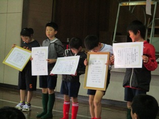 私から獲得した賞状を並べて功績を讃えるとともに、この一年、3年生の以上の希望者ではありましたが、部活動を通して子どもたちはいろいろな経験をすることができたことのすばらしさを話しました。勝敗だけでなく目標をもって取り組むことの大切さとともに、滝尾小の仲間と助け合うことも学ぶことができたと思います。お別れ試合後の6年生から5年生以下の後輩への感謝の言葉も下級生にとっては励ましに聞こえただろうと思います。