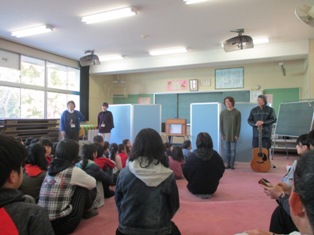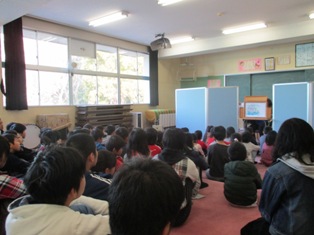 今年度最後の読み聞かせとして、保護者の坂本さん・青木さん、そして本校の藤本・川西が手作り紙芝居を披露してくれました。制作に数ヶ月を要したということで、とても立派なものが仕上がっていました。14日(水)、全校児童に歌・ギター演奏付きで演じられ、子どもたちも夢中で聞き入っていました。読み聞かせを担当いただいたPTA母親部や地域の読み聞かせボランティアの皆さんも、とても感心されていました。