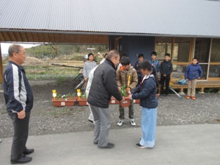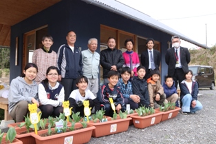 また、玉虫仮設には下校途中に仮設近隣の6年生たちがチューリップを届け、住民の皆さんから「中学校でも頑張って」と励まされ、記念撮影も行いました。チューリップが仮設で人々の心を温かくしてくれることだと思います。