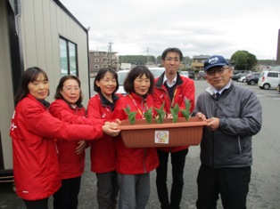 16日(金)、町内5カ所の仮設住宅団地と支え合いセンターにチューリップの苗45鉢を届けました。本ブログNO125で紹介したチューリップを子どもたちが世話をし、花を咲かせるくらいに大きくなりましたので、今回の仮設住宅団地への配付となりました。