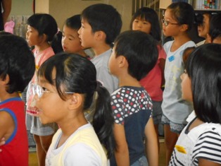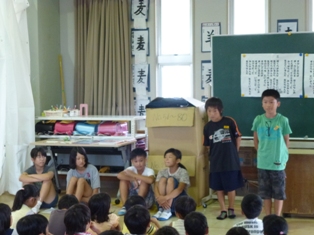 子どもたちの1学期を振り返っての発表や夏休みの生活についての先生方からの話などがありました。地震後の御船中での50日あまりは、実に多くの経験の機会でした。欠席が少なく、子どもたちはよくがんばった1学期でした。