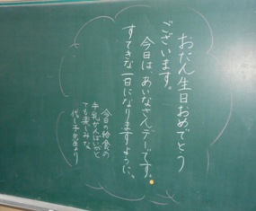 4月の前震の翌日15日(臨時休校の日)は、あいなさんの誕生日でした。担任の先生が学級で誕生日を祝う気持ちが伝わってきます。滝尾小の見回りで行くたびに、黒板を目にして時間の経過と現在の滝尾小の子どもたちのことに思いを重ねてしまいます。あいなさんは元気でがんばっています。