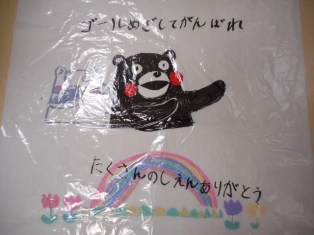 今週末行われる熊本城マラソンの出場ランナーに激励ポンチョを全校児童で制作しました。くまモンなどのキャラクターの絵とともに、熊本への支援に感謝する気持ちを込めた言葉を書き添えています。滝尾小の子どもたちが制作したポンチョを身にまとったランナーの皆さんの完走を祈っています。今回のポンチョには滝シシも描かれています。滝シシの県下へのお披露目?です。