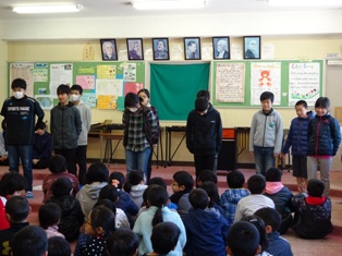 今年度最後の読み聞かせとして、保護者の坂本さん・青木さん、そして本校の藤本・川西が手作り紙芝居を披露してくれました。制作に数ヶ月を要したということで、とても立派なものが仕上がっていました。14日(水)、全校児童に歌・ギター演奏付きで演じられ、子どもたちも夢中で聞き入っていました。読み聞かせを担当いただいたPTA母親部や地域の読み聞かせボランティアの皆さんも、とても感心されていました。