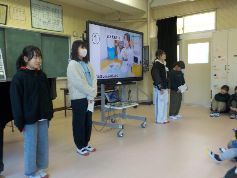 朝は、全校コミュニケーションタイム! 今日は縦割り班ごとに①「フルーツバスケット」をして、②1年間の心に残ったことを発表する会でした