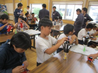 御船高校で「小学生エンジョイプラン~高校生による小学生ものづくり体験~」(3・4年生は紙飛行機、5・6年生はペットボトルロケットの制作と競技大会)を行いました。