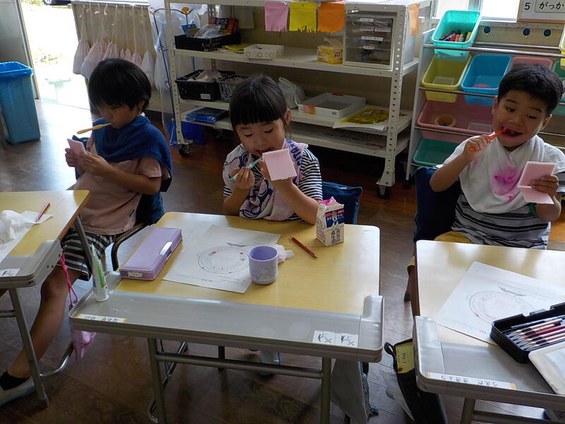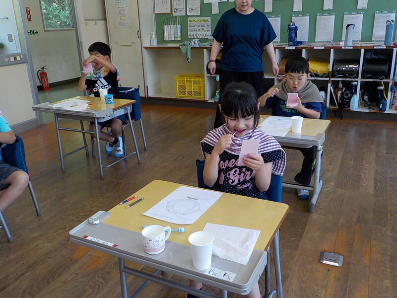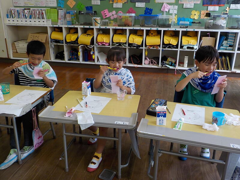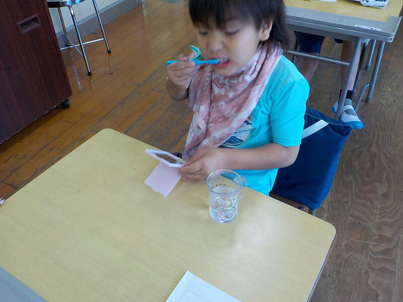 1年生は、「歯と口の保健指導」の時間がありました! 歯ブラシで磨きにくいところを”染め出し”をして確認しました。歯の、赤く染まった汚れが残っているところを、鏡を見ながら丁寧に磨いて、真っ白な歯にしましたよ! 今日みたいに丁寧な歯磨きで、自分の歯をむし歯から守りましょうね