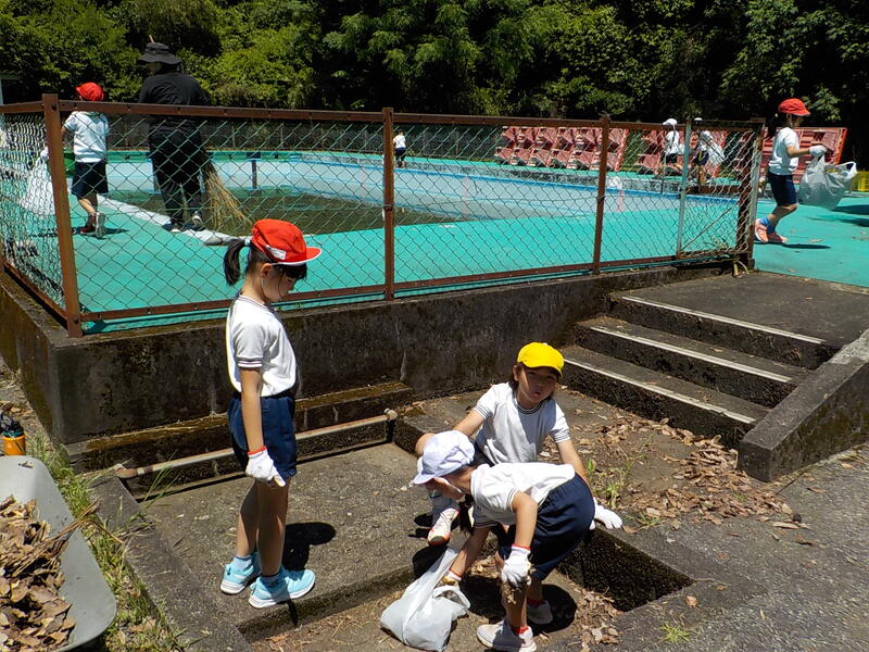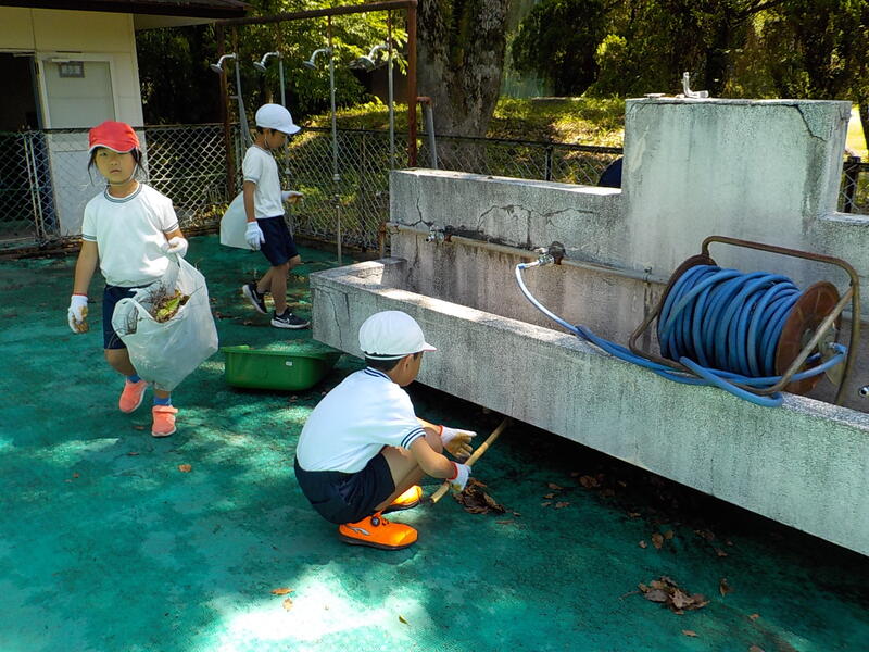 1、2年生は午前中にプールサイドや手洗い場の落ち葉集めを中心に掃除しました! 1、2年生協力して頑張っていました