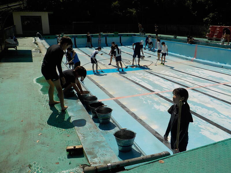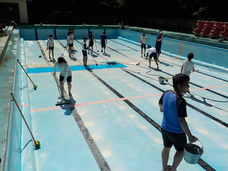 3~6年生は、午後からプールのそうじを頑張りました! 快晴で暑かったけれど、プール掃除で使う水が冷たくて、気持ちよかったそうです! これで今年も思いっきり水泳の学習ができますね! きれいにしてくれて、ありがとう
