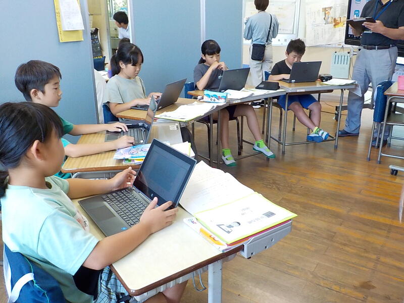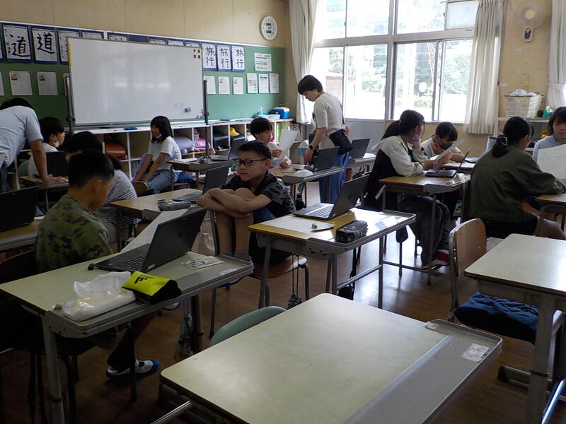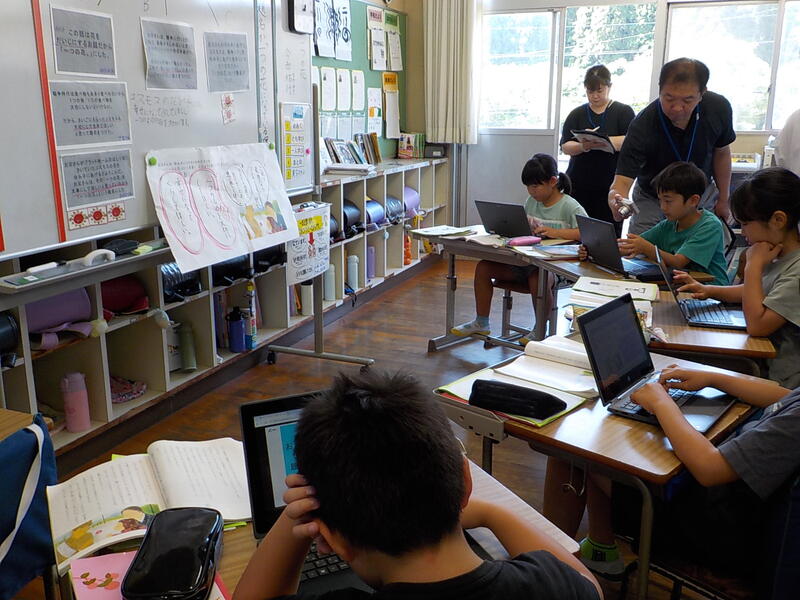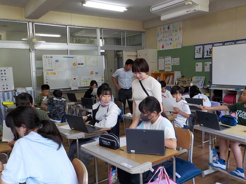 3、4年生は、社会の学習、3年生は御船町の良いところ探し、4年生は熊本県の地形を調べていました