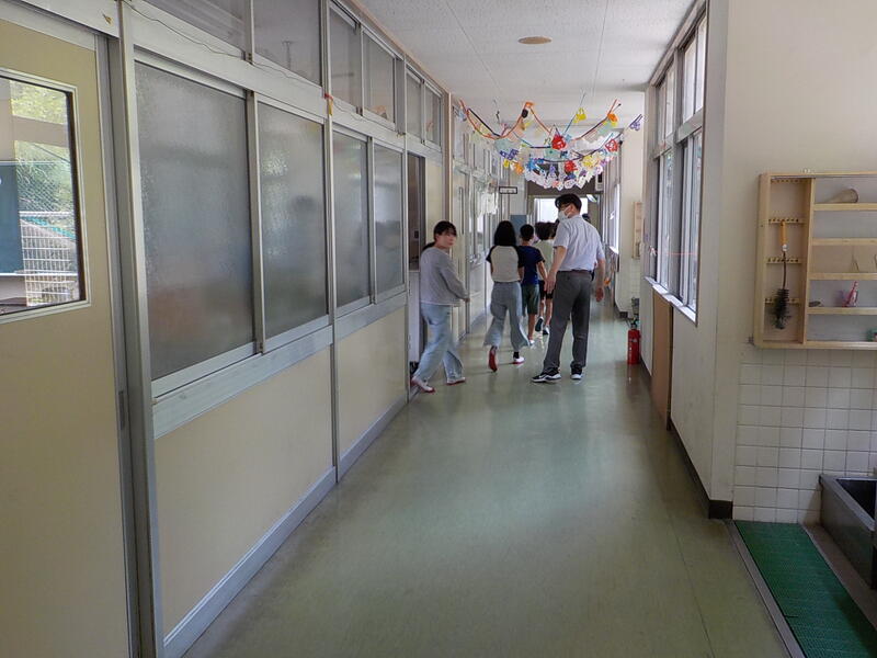 1年生は、先生のお話を上手に聞いていました! 学校探検をして、学校中を巡った後でした