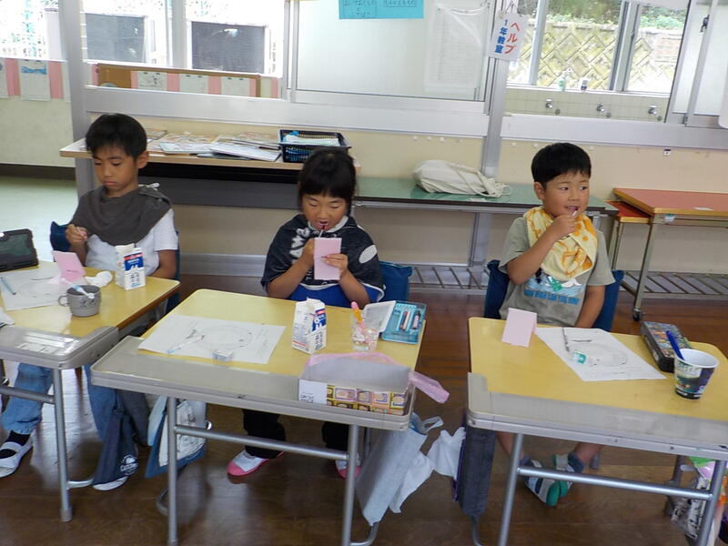 今日から牛乳にストローがついていません、でも、こぼさずに開けて飲むことができましたね! さすがです!