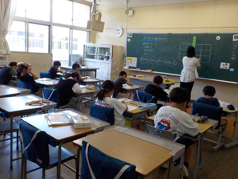 3、4年生は算数の時間、3年生はノートの使い方を学習していました。4年生は、複雑な式をたてる問題にチャレンジしていました